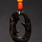 Black Jade 'Fish/Dragon' Pendant with Coral Beads Han Dynasty, China